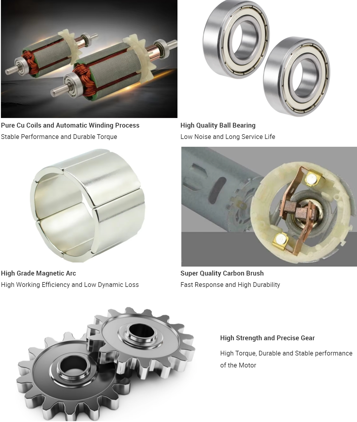 Permanent magnets are installed on the stator to generate a fixed magnetic field; There are armature windings and commutators on the rotor. The armature winding is connected to the external circuit through electric brushes. When current passes through the armature winding, a rotating magnetic field is generated, which interacts with the magnetic field generated by the permanent magnet to drive the motor to rotate.