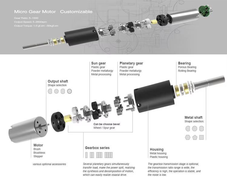The sun gear acts as the central gear in a planetary gear system, receiving rotation from the input shaft. it exerts force on the planetary gears, causing them to rotate. The inner ring gear is fixed, the planetary gears will also revolve along the trajectory of the inner ring gear while being driven by the sun gear. The planetary gear is connected to the output shaft through a planetary carrier, so when the planetary gear rotates and revolves, it will ultimately transmit the rotational force to the output shaft, achieving the effect of deceleration and increasing torque.
